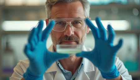 Scientist examining a petri dish with a focused expression