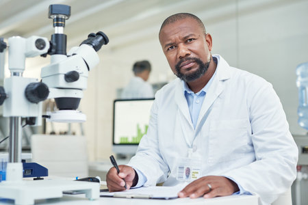 Portrait of serious male scientist looking at camera while working in laboratory