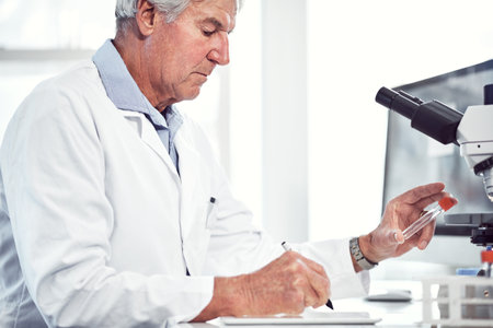 This vile seems a bit different. a focused elderly male scientist holding up a test tube and making notes while being seated inside of a laboratory.