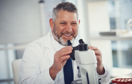 I mightve discovered something that no one has before. Portrait of a mature scientist using a microscope in a lab.