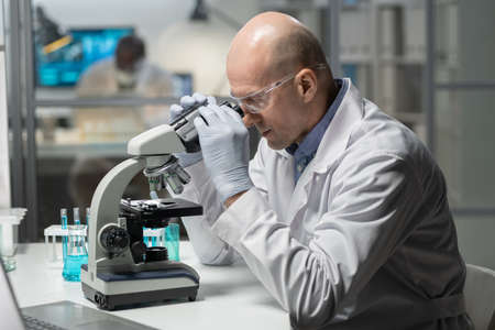 Experienced chemist in lab coat and surgical gloves studying new chemical element in microscope in scientific laboratory