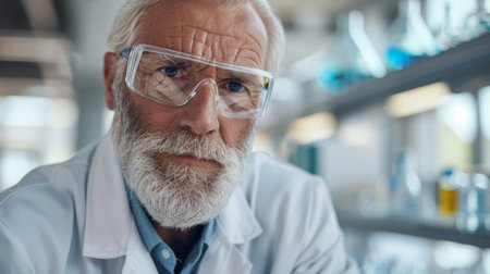 Portrait of senior male scientist in lab coat and protective glasses looking at camera