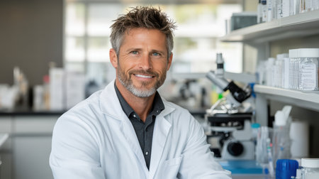 A smiling man in lab coat working in modern laboratory setting