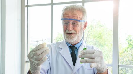 close up face of Senior male scientist holding a tube and beaker with liquid substance. Man Research is working in the Laboratory.