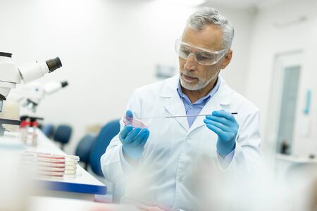 Middle-aged male expert researcher examines a petri dish with tissue grown in a laboratory.