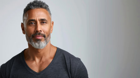 mature handsome man portrait with grizzled beard hair, male beauty. Man face portrait, banner with copy space.