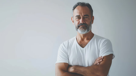 Studio portrait of a cheerful mature man with gray hair and beard, wearing a casual gray t-shirt, standing against a white background with his arms crossed, exuding confidence and approachability