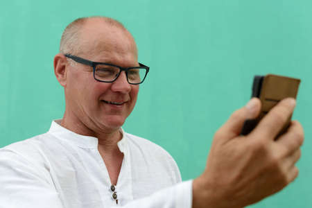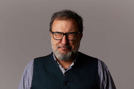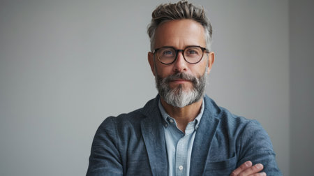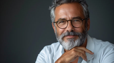 Portrait of a handsome mature man with gray hair and beard wearing glasses
