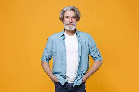 Elderly gray-haired mustache bearded man in casual blue shirt posing isolated on yellow background studio portrait.