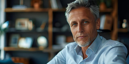 A mature man with gray hair, resident of USA, smiles gently. The warm lighting creates a cozy atmosphere. Calm, confident look. Experience, professionalism and intelligence in the eyes. Generative AI.