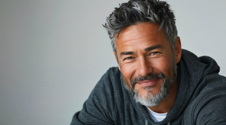 Smiling mature man with silver hair, minimalist style, medium closeup