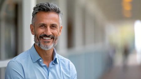 Portrait of mature age, middle age, mid adult man in 50s, happy confident smile. Copyspace.