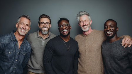Portrait of happy multiethnic men looking at camera while standing against grey background