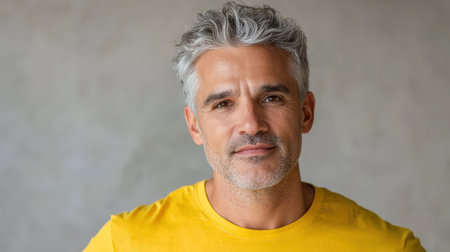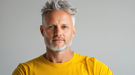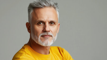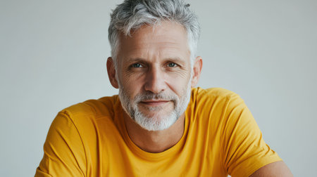 Close up of mature man with white skin, grey short hair, wavy hair and a clear yellow t shirt, isolated in a light grey studio. Portrait person