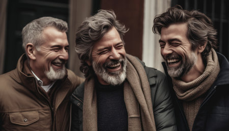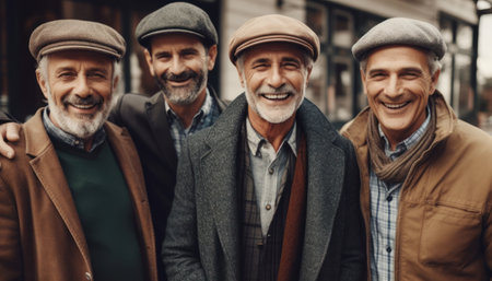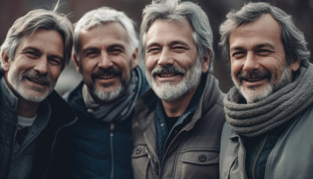 A heartwarming scene featuring four cheerful older men, all with gray hair and beards, sharing laughter under a lush green canopy. Their genuine smiles radiate warmth and camaraderie, capturing the essence of friendship and the joy of shared moments.