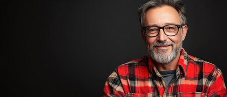 A man with glasses and a beard stands smiling, wearing a red and black plaid shirt in a warm atmosphere.