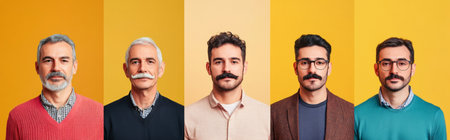 Collage of men with different mustaches posing against color backgrounds, AI Generated