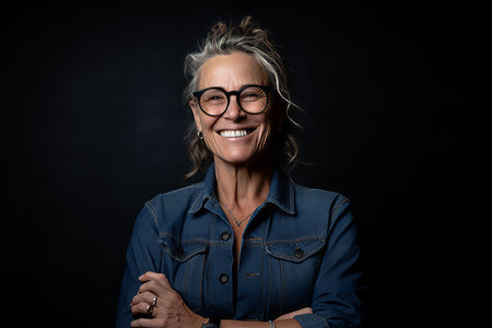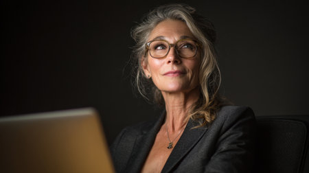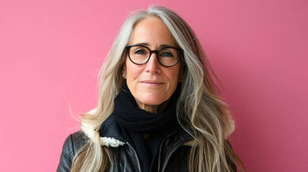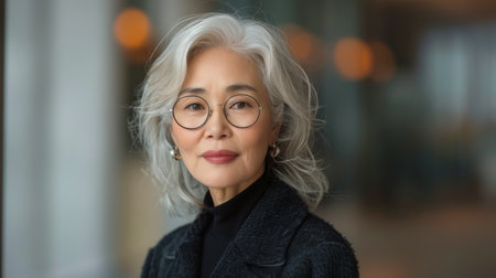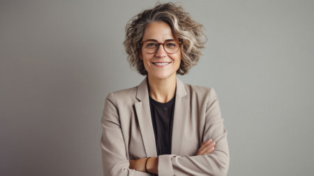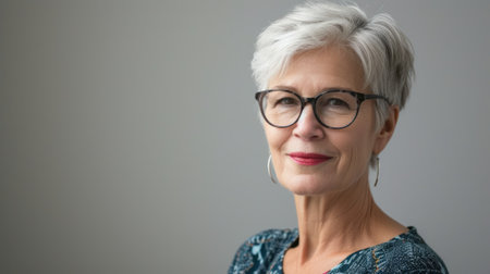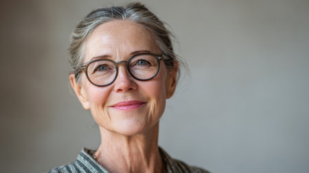 A portrait of a mature woman with glasses and gray hair, radiating warmth and confidence. The soft lighting and neutral background enhance her serene expression.
