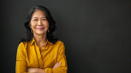 A woman in a yellow shirt stands confidently with her arms crossed.
