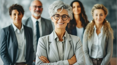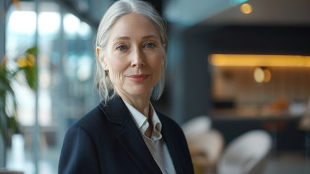 Portrait of mature businesswoman with gray hair looking at camera.