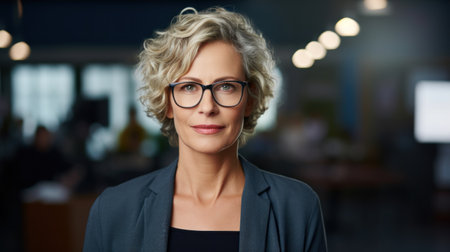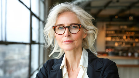 Professional middle aged woman wearing glasses looking out with grey hair in office setting