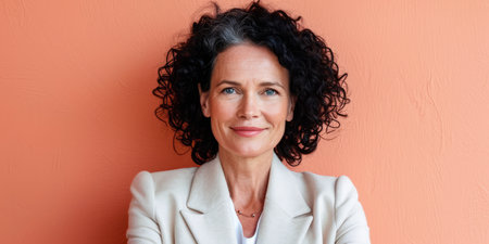 Close up of a confident middle aged woman with a peach copyspace background
