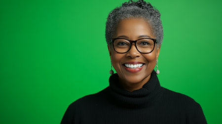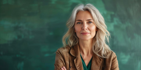 Confident And Happy Middleaged Woman Poses In A Green Studio Setting, Copy Space. Сoncept Fitness Photoshoot, Nature-Inspired Backdrops, Creative Lighting Setup, Professional Headshots, Candid Moments.
