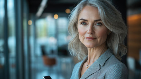 Mature businesswoman is holding a smartphone and looking confident in an office building
