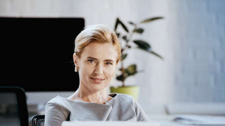 Smiling businesswoman looking at camera in office