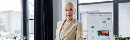 senior banker smiling at camera near flip chart with graphs on blurred background, banner