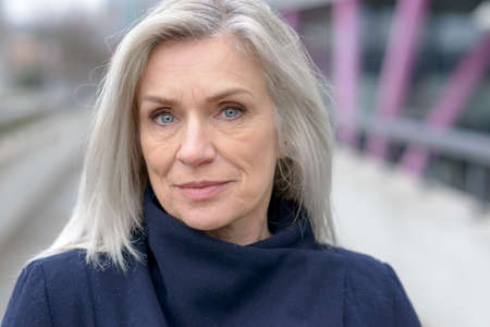 Pretty natural grey blond middle-aged woman with a lovely smile looking into the lens as she stands on an outdoor pedestrian walkway in town