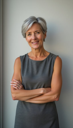 A poised middle-aged woman with striking silver hair stands confidently with her arms crossed, exuding warmth and approachability. Her elegant gray dress complements her radiant smile, creating an inviting atmosphere that speaks to both professionalism and friendliness.