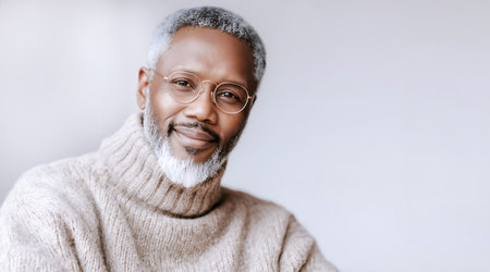 Portrait of a mature African man with a gray beard and hair, wearing eyeglasses and a black shirt, confidently looking camera. Blurred background copy space. Stylish professional.