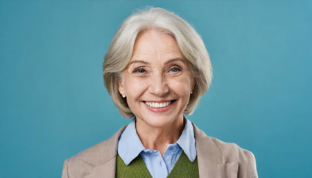 A cheerful senior woman gazes directly at the camera with a radiant smile, set against a calming blue backdrop. Her warm expression conveys positivity, resilience, and timeless grace,