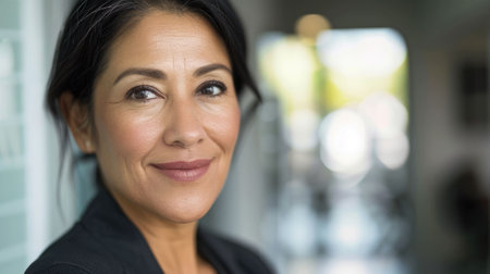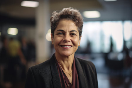 Mature smart hispanic businesswoman, smiling face, standing in blur background of busy office. Generative AI AIG20.