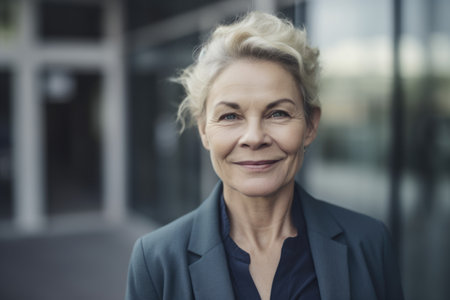Mature smart swedish businesswoman, smiling face, standing in blur background of modern office building. Generative AI AIG20.