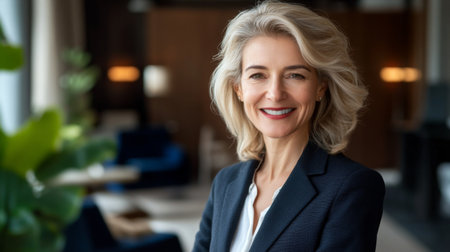 Confident businesswoman smiling directly at the camera, dressed in a tailored suit, with a modern office backdrop