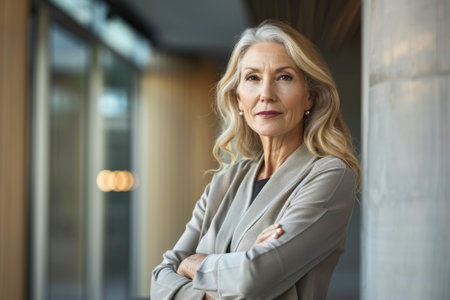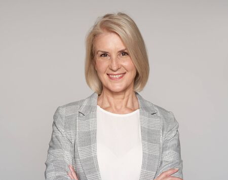 a mature Caucasian woman, likely in her 50s or 60s, standing with her arms crossed. She exudes a professional and successful aura.