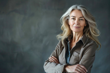 Portrait of mature 55 - 60 year old woman with gray hair, arms crossed