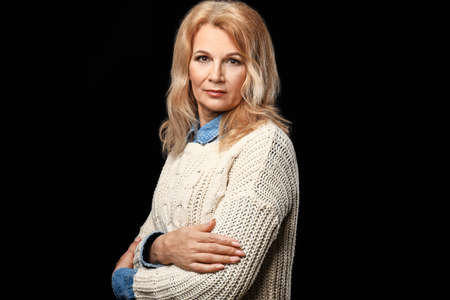 Portrait of beautiful mature woman on dark background