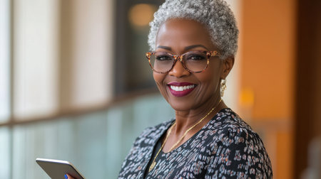 A confident middle-aged woman with stylish glasses smiles while holding a smartphone in a bright, modern office setting, radiating professionalism and elegance.