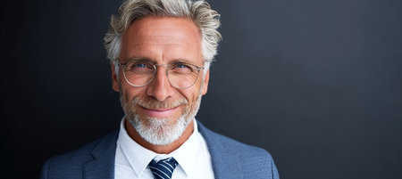 A distinguished older man with gray hair and a beard exudes confidence and warmth, dressed in a sharp suit. His genuine smile and relaxed posture create an inviting atmosphere, perfect for showcasing professionalism and approachability.