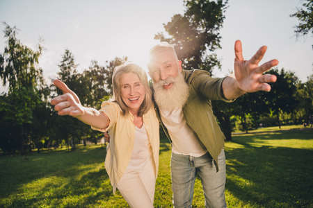 Photo of mature couple good mood open arms hug cuddle welcome friendly in park with sunny weather outdoors