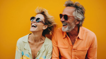 Happy senior couple in sunglasses looking at each other and laughing while standing against yellow background.