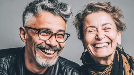Portrait of happy mature married couple, modern man woman laughing and looking at camera