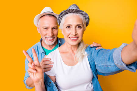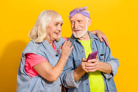 Photo of attractive retired husband wife wear jeans clothes typing modern device hugging isolated yellow color background