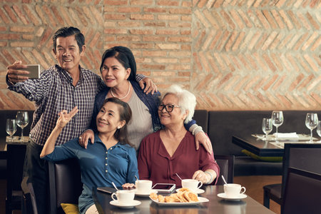 Group of smiling senior friends in casual outfits using smartphone while taking selfie together in cafe