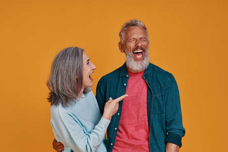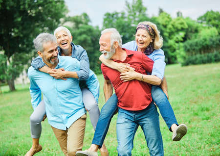 Retired couple playing to be young. Elderly couple having fun. Best elderly friends laughing at the camera. Retired and young concept.