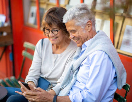 Portrait of joyful senior married couple - Retired couple enjoying free time taking funny selfie - middle-aged couple having fun together using smartphone