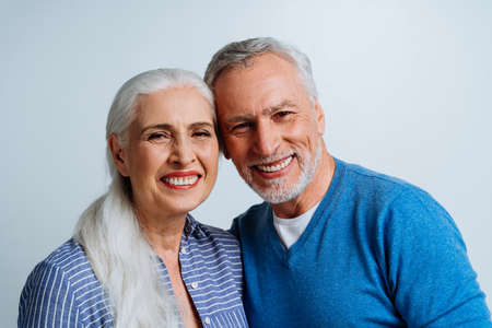 Minimal portrait of carefree senior couple embracing and looking at camera while standing against white background
